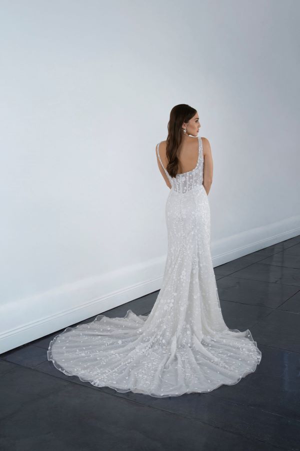 A timeless, classic design for the modern bride. This sheath wedding dress features a square neckline and is adorned with a stunning mix of beading and delicate 3D floral appliqués. The gown includes a side overlap split for just the right touch of allure.