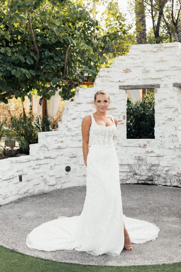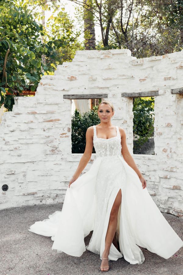 Paired with a matching overskirt, this look gives you two styles in one — perfect for brides who want a sophisticated ceremony look and a sleek, sexy reception transformation.