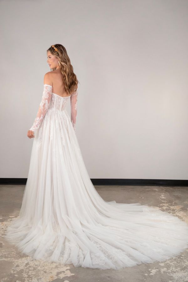 A soft, romantic A-line wedding dress with delicate detachable lace sleeves. The sheer lace bodice is lightly corseted for shape, featuring a flattering sweetheart neckline that softly defines the décolletage.