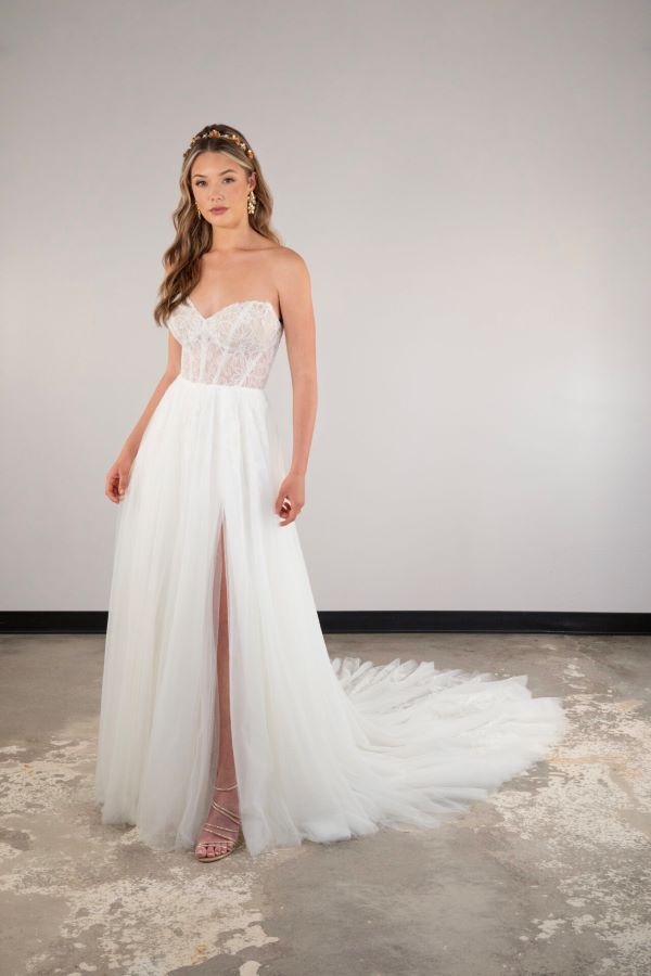From minimalist crepe dresses to dramatic ballgowns and detachable overskirts, Essense of Australia offers versatility for every bridal vision. Brides can expect thoughtful features like corsetry support, customizable options, and inclusive sizing to ensure a flawless fit and feel.