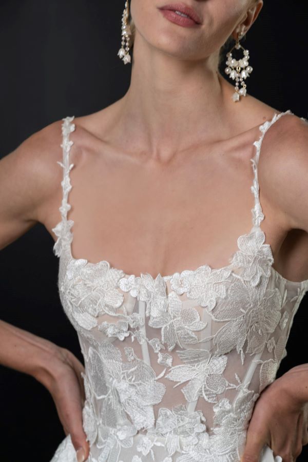 Martina Liana 1749 floral lace ballgown . Romantic is the style of this dress . The square front neckline is very flattering the added 3D floral applique just adds an extra dimension to the dress . The skirt is cut in a full circle with scattered organic floral lace