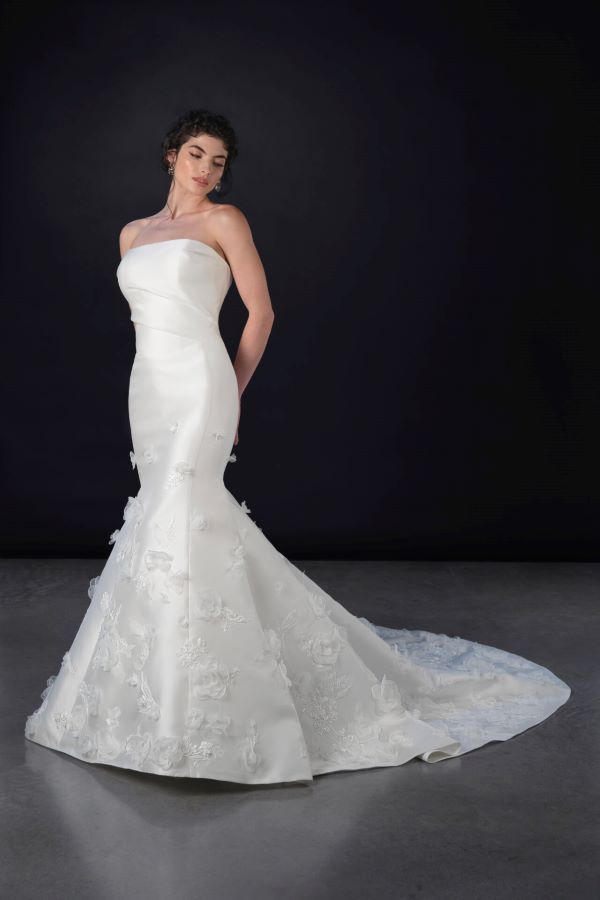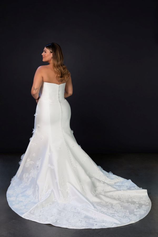Martina Liana Style 1868 is the definition of modern couture bridal. A luxe fit-and-flare silhouette makes a bold yet timeless statement. The strapless neckline is cut clean and straight across, softened by diagonal pleated ruching that wraps the bodice in a flattering, architectural way. A subtle V-shaped waistline elongates the figure, leading into a two-panel skirt that hugs the body before flaring out gracefully. Delicate embroidered flowers are scattered from the skirt down to the hem, adding a soft, romantic touch.