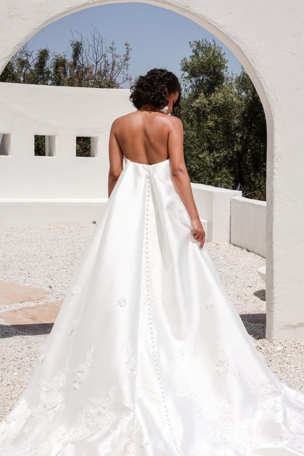 For the minimalist bride, this gown also comes in rich silk zibeline, offering a sleek, sculptural look without the floral embellishments. The matching cape, sold separately, completes the look with a dramatic flair—perfect for a grand entrance.