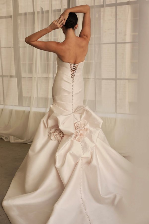 A dramatic skirt unfolds from a cloud-like front and back pickup, adding a touch of whimsical romance. Optional silk floral accents at the front pickup and each back curve elevate the design with couture flair. A flowing train completes the look, making every step down the aisle unforgettable.