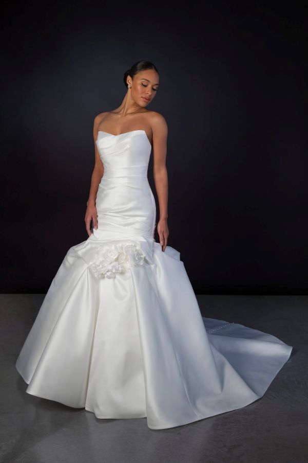 This gown offers a confident, sculpted fit that flatters a wide range of body types—perfect for the bride who wants a bold, fashion-forward silhouette with a nod to vintage glamour.