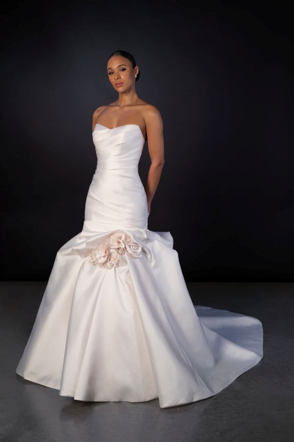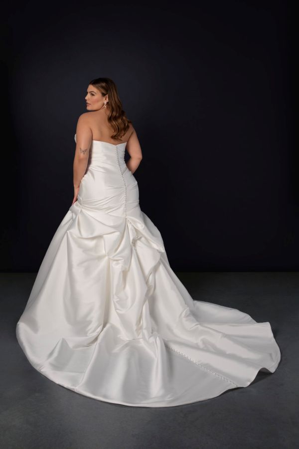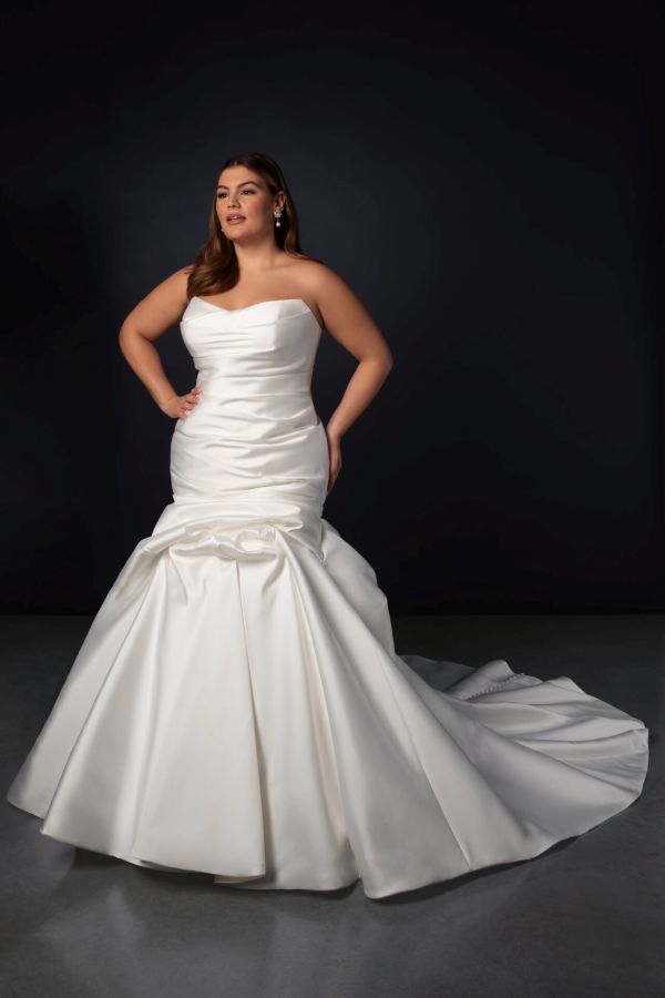 The strapless bodice features a flattering V-shaped neckline and expertly designed diagonal ruching that contours the silhouette from bust to below the hips, creating a sculpted hourglass effect. The structured fit enhances and celebrates your natural shape with timeless precision.