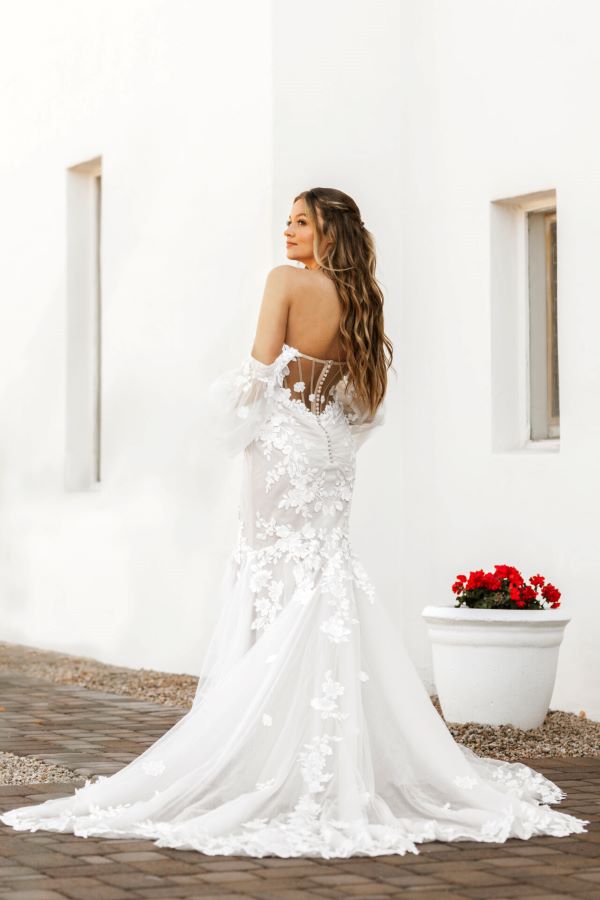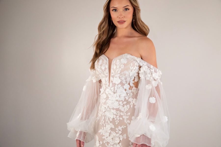 From minimalist crepe dresses to dramatic ballgowns and detachable overskirts, Essense of Australia offers versatility for every bridal vision. Brides can expect thoughtful features like corsetry support, customizable options, and inclusive sizing to ensure a flawless fit and feel.