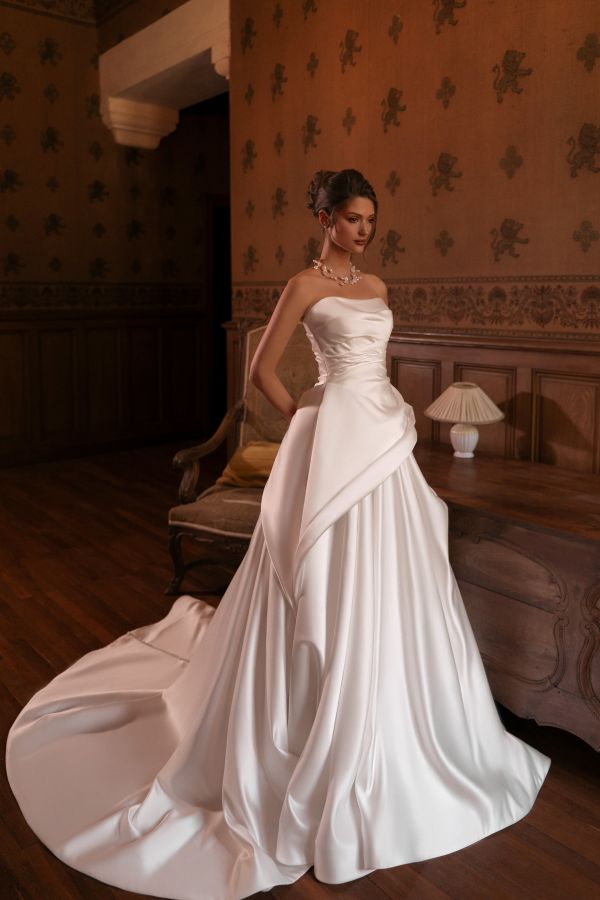 Katy Corso – Alaia Alaia is the embodiment of classic romance — like walking on a cloud. This dreamy gown features a strapless bodice with a subtle dip, creating a soft, flattering neckline. Elegant pleating flows gracefully across the bodice and continues into the A-line skirt, creating a gentle peplum effect that adds dimension and movement. A structured inner corset offers support and shape, secured with delicate loops and buttons at the back. Understated yet distinctive, Alaia is the perfect blend of timeless design and modern detail.