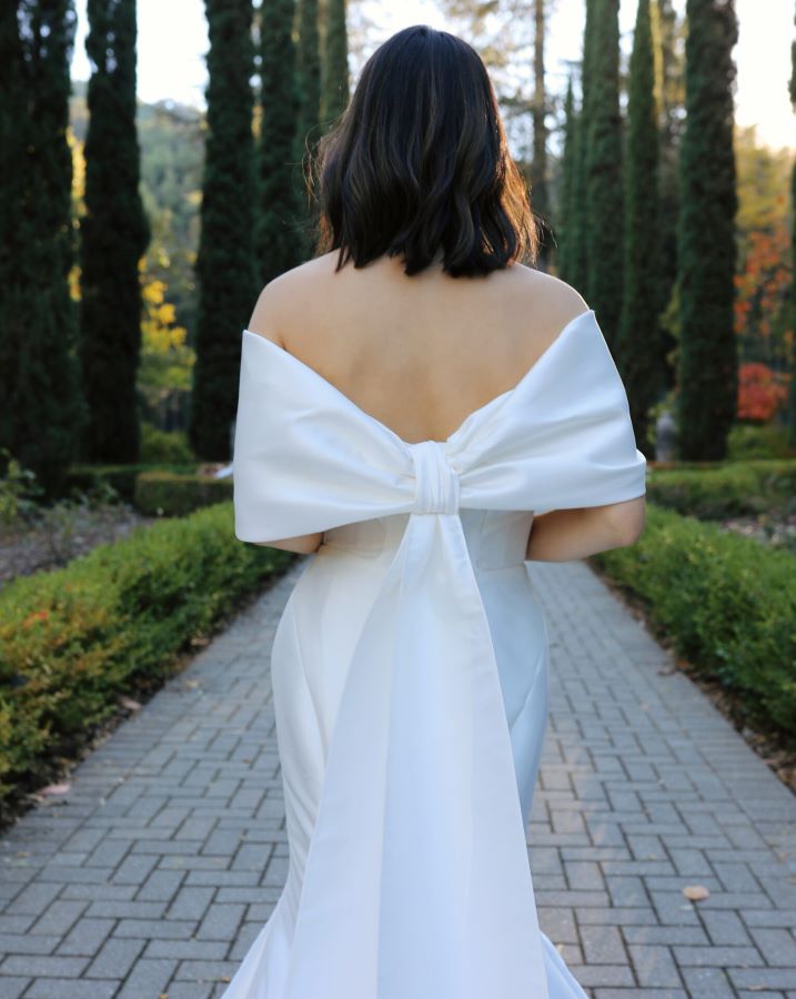 At the back, the band continues into a stunning couture-inspired bow, finished with two elegant tails that cascade down the back of the gown, adding a bold yet refined statement. Simple in its design, but with dramatic, high-fashion details, this dress is made for the bride who wants classic luxury with a modern twist.