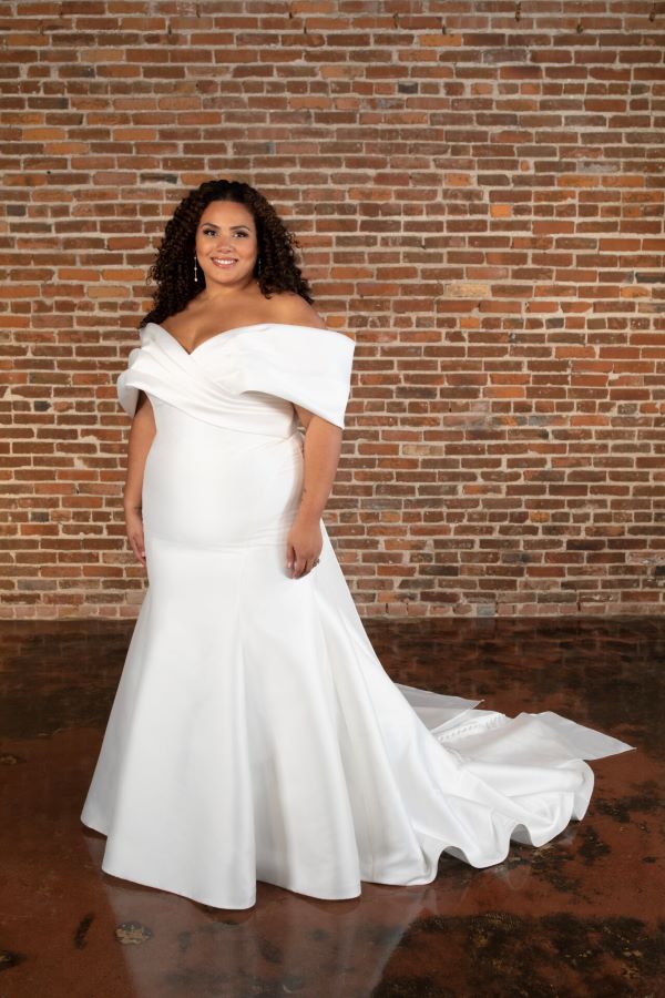 Essense of Australia - D3754 For the modern bride craving timeless elegance with a touch of drama, this off-the-shoulder Mikado mermaid gown delivers effortless sophistication. The glamorous off-shoulder band gracefully pleats into the front bodice, creating a clean and flattering neckline that highlights the shoulders and décolletage. Crossover pleating at the waistline enhances and sculpts the figure, offering a sleek and feminine silhouette.