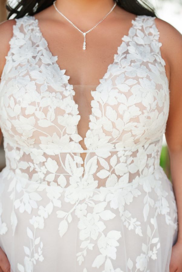 Essense of Australia D3783 lace and tulle Aline wedding dress. This dress is structured for the fuller bust bride, with the thicker straps giving great support. The back V scooped neckline to isn't low at center back. It has a flatter band at waist to enhance waistline. The skirt isn't full, it is a soft flowing skirt. This dress has no beading giving you a relaxed whimsical vibe.My sample is a size 18