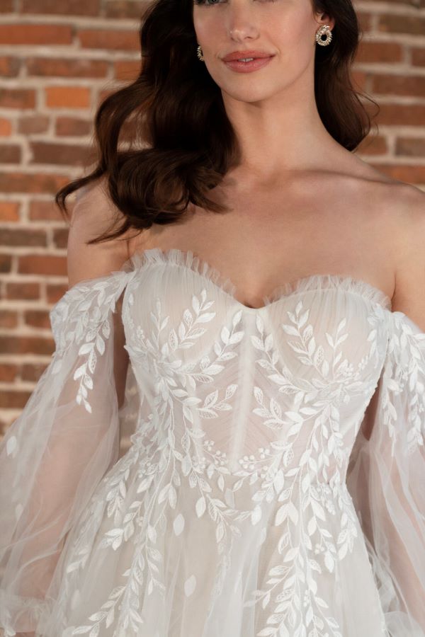 Essense of Australia - D3787 For the free-spirited bride, this BOHO-inspired wedding dress blends romantic details with effortless style. The strapless, sheer corset bodice features visible boning and delicate leaf lace appliqué, offering structure while keeping things light and airy. The soft tulle skirt flows beautifully with cascading leaf lace details and a modern side split that adds just the right touch of drama.