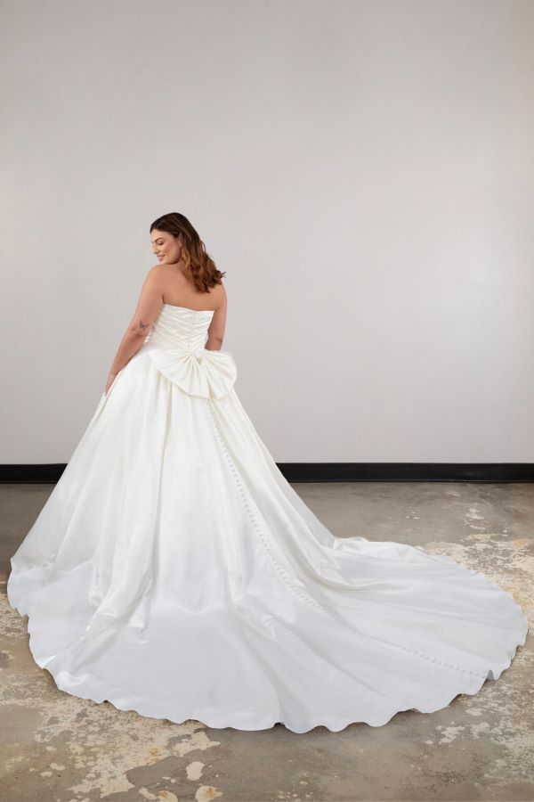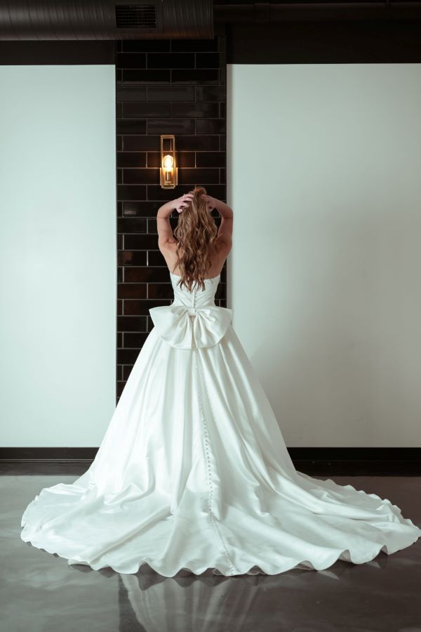 The box-pleated skirt brings that grand, regal presence, perfect for a statement entrance. And the detachable back bow? A stunning 90s-inspired detail that gives the gown a charming, vintage twist while still feeling fresh and sophisticated.