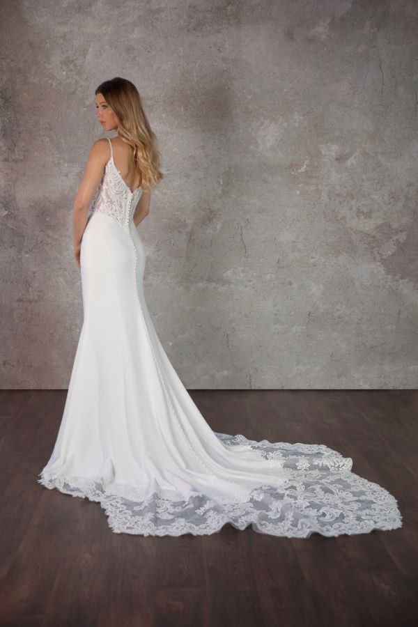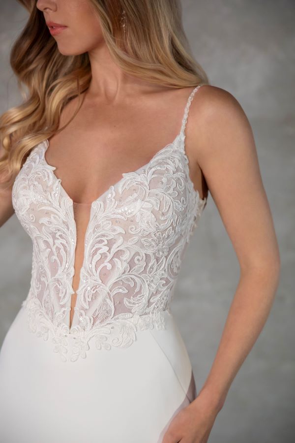 Essense of Australia D4181 Crepe and sheer lace bodice wedding dress . The front neckline is V shaped with the back V is higher V cut this allows great bust support . Front & back bodice also dips down into a V at center front and back . Skirt is in crepe , back train has lace edge trim