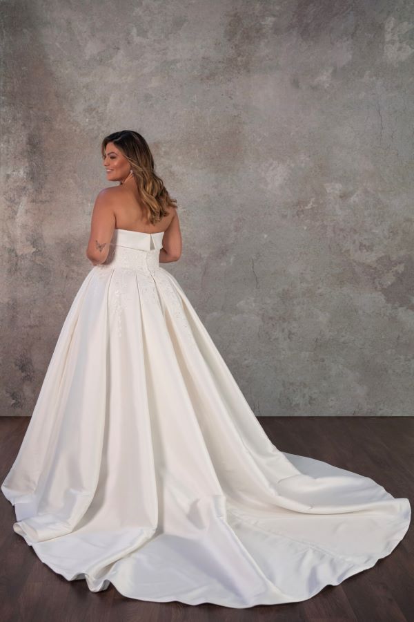 For the bride who wants to make a statement, this breathtaking ball gown comes in classic Ivory embroidery or a unique colored embroidery option—perfect for those looking to stand out on their special day. The strapless bodice features a clean, straight-across neckline with a chic banded finish. Delicate embroidery starts at the bodice and softly scatters down into the full skirt, adding a touch of romance and whimsy. The skirt itself is beautifully structured with knife pleats, giving it that timeless ball gown volume. Our sample is in a plus size to showcase the incredible structure and support in the bodice—it’s designed to flatter and hold you in all the right places.