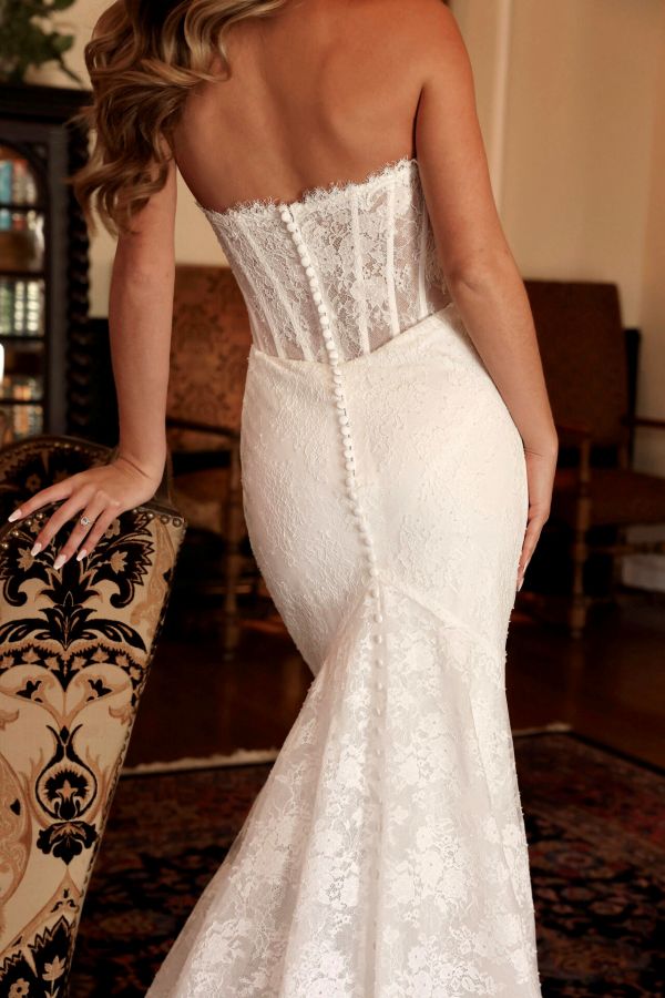 Matching lace sleeves add a touch of vintage charm and versatility. The lined lace skirt flares subtly below the hips, finishing with a scalloped lace hem that trails into a graceful train.