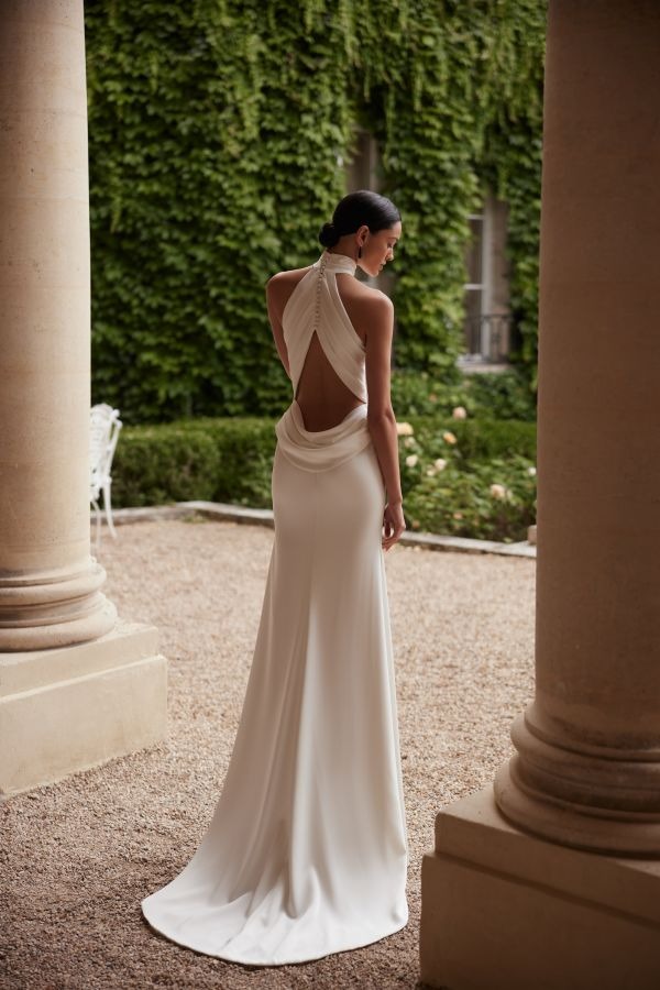 Style with hair pulled back to showcase the dramatic back, or worn loose for a softer edge. Finish the look with a pearl or lace veil to elevate this minimalist masterpiece.