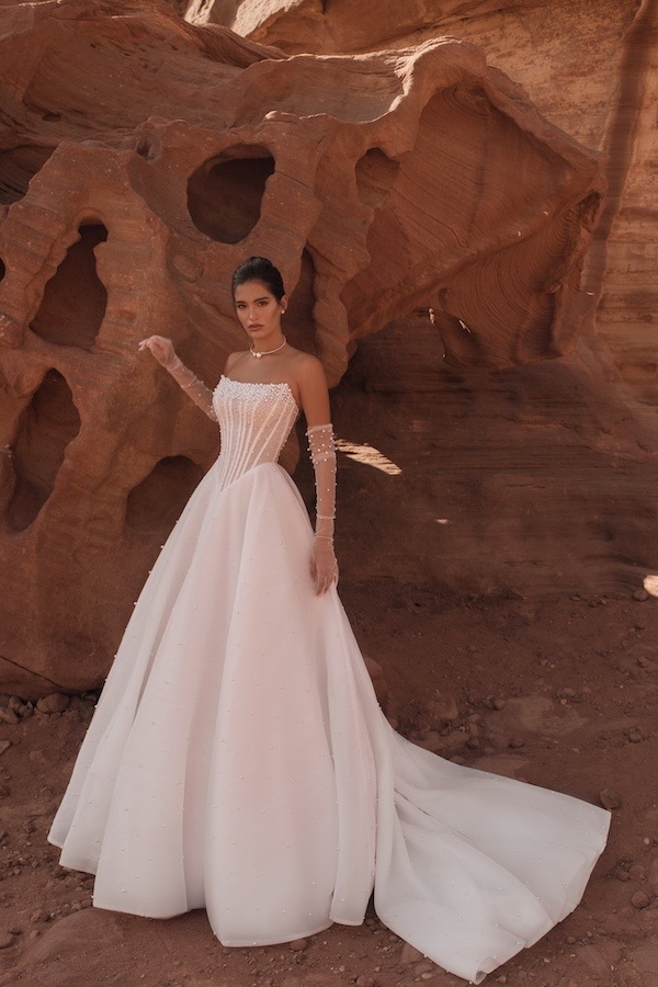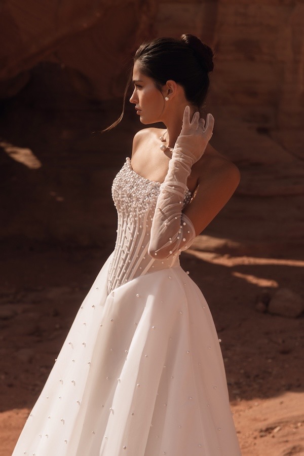 Elody — a gown of refined luminosity and modern fairy-tale romance. Its voluminous A-line skirt is crafted for brides who seek soft radiance and contemporary enchantment. The strapless corset, made from semi-sheer mesh and richly embellished with pearls that gradually disperse toward the waist, lends the look a delicate glow. The clean straight neckline beautifully accentuates the neck and collarbones, while the vertical boning visually elongates and narrows the basque waist. At the back, an internal lace-up construction and hidden zipper ensure a flawless fit. The multilayered skirt — created from airy organza, layers of tulle, and satin-lined atlas — cascades softly, forming an ethereal volume and cloud-like lightness of silhouette. The tactile delicacy of the fabrics enhances the impression of weightlessness and grace.
