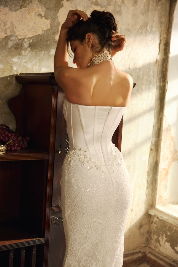 Lunia by Nomes is a structured sheath-cut wedding dress that blends modern elegance with striking detail. Crafted with a smooth satin bodice, it features visible boning for a sculpted finish and a pearl-detailed cat-eye strapless neckline for a refined, romantic touch. The basque waistline flows into a flattering V-shaped waist, highlighted with delicate pearl accents.