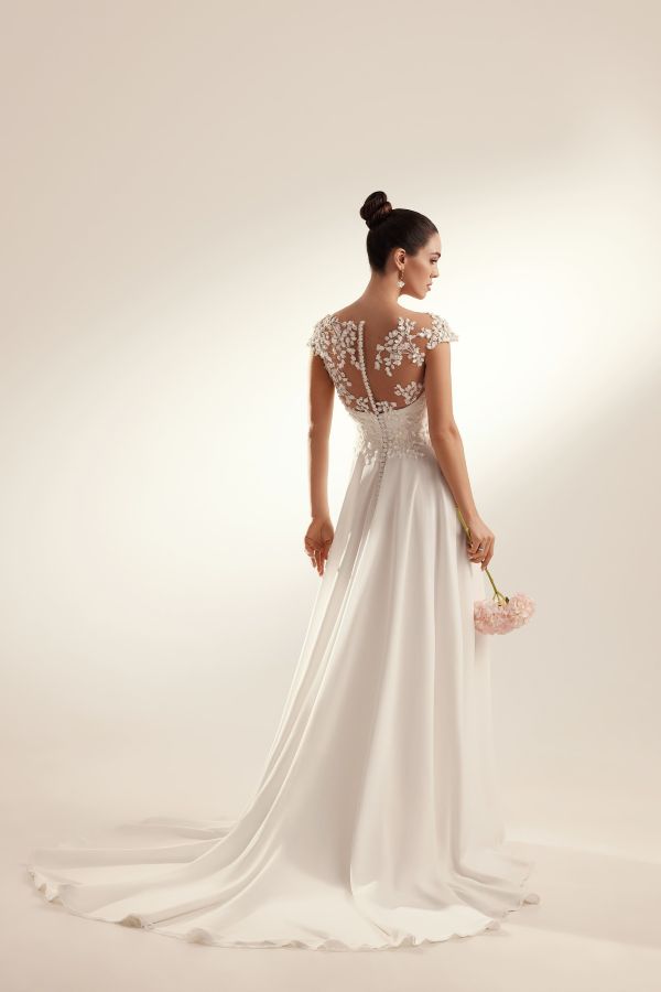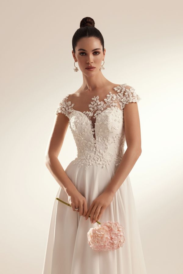 Katy Corso – Marlena A dream dress for the bride who adores soft, romantic silhouettes. Marlena features flowing chiffon in a gentle A-line shape — not too full, just enough to glide effortlessly with every step. The illusion tulle bodice is adorned with delicate leaf lace detailing and charming cap sleeves, adding a touch of whimsy and elegance.