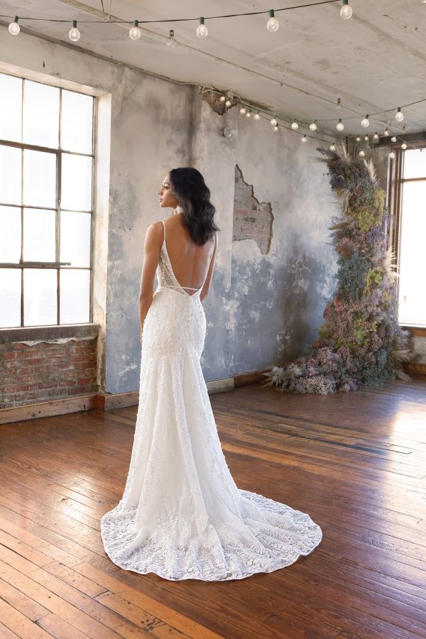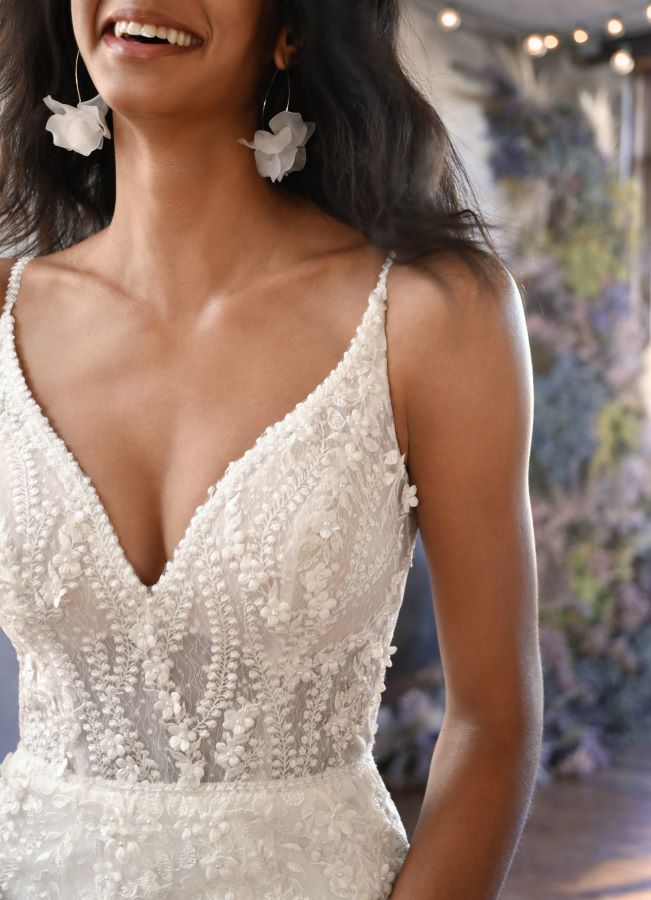 Modern boho meets timeless elegance in the Monro gown — now at an incredible 50% off! This sheath-style wedding dress features a modest V-neckline in the front and a deeper V back that dips just below the waistline for a subtly sultry finish. The opaque-lined bodice offers both comfort and structure, while the exquisite detailing steals the show. Tastefully embellished with 3D floral appliqués and delicate linear beading, Monro strikes the perfect balance between intricate and effortless. The lace detail is thoughtfully heavier along the hem, gradually fading upward to elongate the silhouette. Flattering and refined, this gown is a dream for the modern romantic.