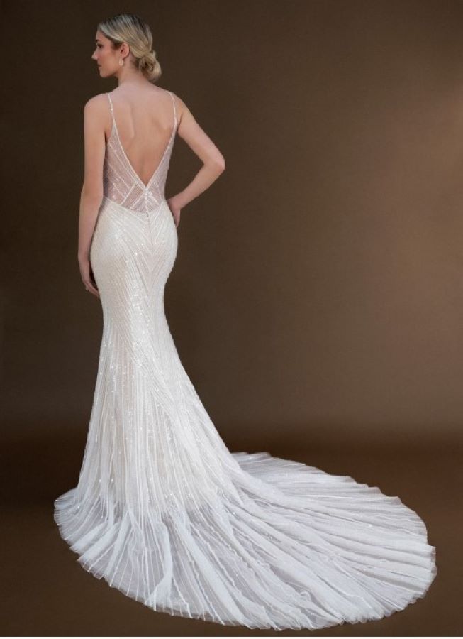 Fully adorned in a striking linear beaded design, PA1350 offers modern elegance with a touch of glamour. 👰♀️ Front: A flattering V-neckline with delicate beaded straps 💫 Back: A low sheer V-back that flows seamlessly to the waistline 🌟 The intricate beading sculpts and enhances the silhouette, making this dress perfect for the bride who wants more than a traditional gown.