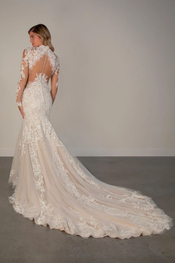 Designed in a flattering fit-and-flare silhouette, the dress strikes a harmonious balance between modesty and sensuality, making it both unique and striking. Ideal for the modern bride who appreciates classic elegance with a contemporary twist, this dress makes a memorable statement on your special day.