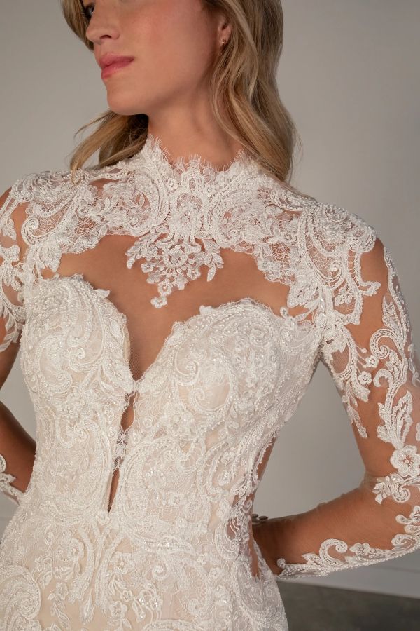 This stunning wedding dress features a high neckline paired with long sleeves, exuding sophistication and timeless charm. Crafted from exquisite beaded lace, the ornate detailing is beautifully placed along the front neckline, lending the gown a distinct vintage vibe. A delicate sweetheart-shaped lace detail at the neckline adds a romantic touch, perfectly complementing the overall design.