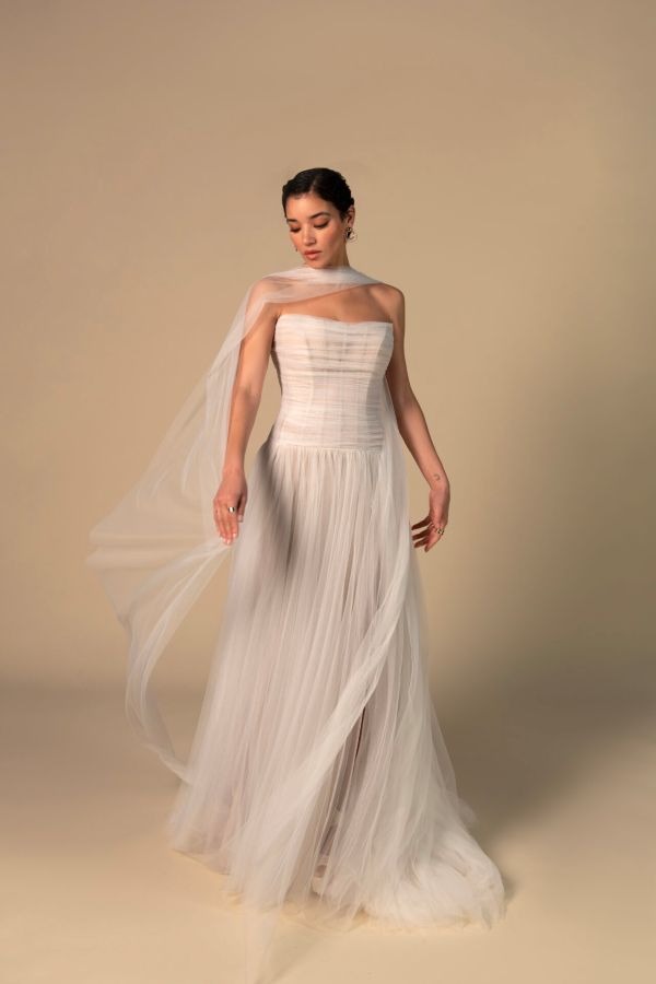 The strapless, straight-across neckline gives a clean, contemporary feel, while the sheer opaque bodice showcases visible boning—adding both support and a striking design detail. The elegant drop waistline elongates the figure beautifully, flowing into a softly gathered tulle skirt that moves effortlessly with every step. A modern side split adds just the right touch of drama and ease.