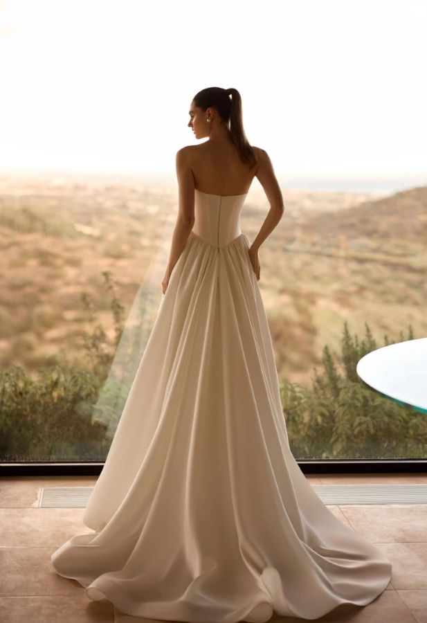 Shiver is a beautifully structured and supportive gown that has flattered every bride who has tried it on. Designed with corseted boning and a pleated bust detail, it creates a sculpted silhouette while still feeling elegant and feminine. The neckline features delicate lace scalloping at both the front and back, adding a soft, romantic finish.
