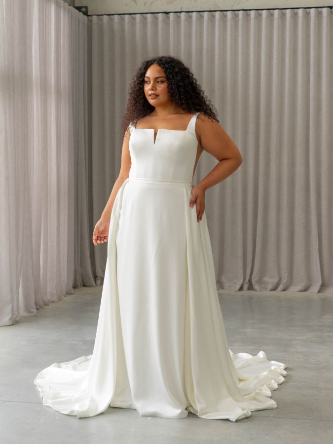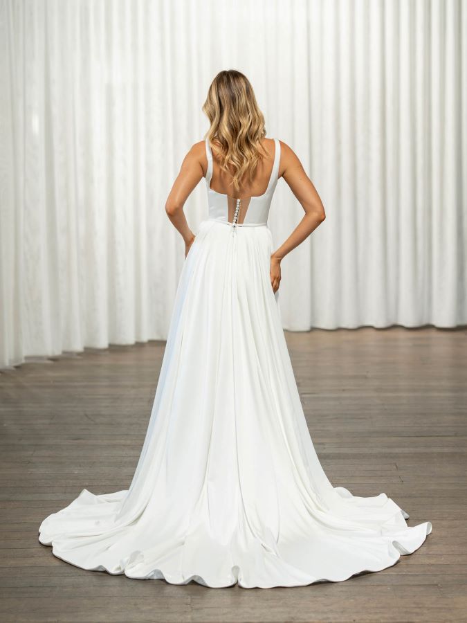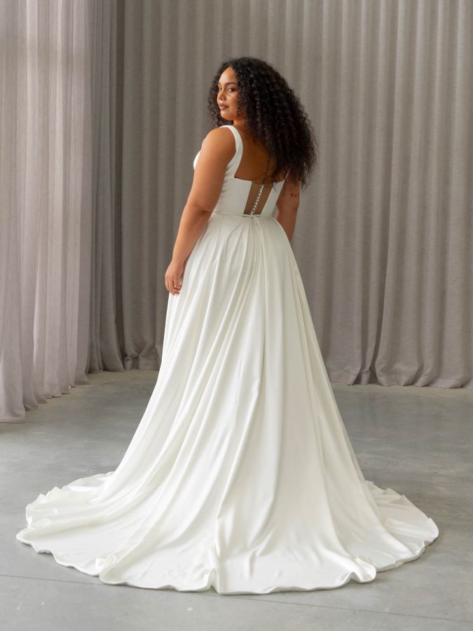 - Style: A-line wedding dress in a luxurious soft stretch satin
