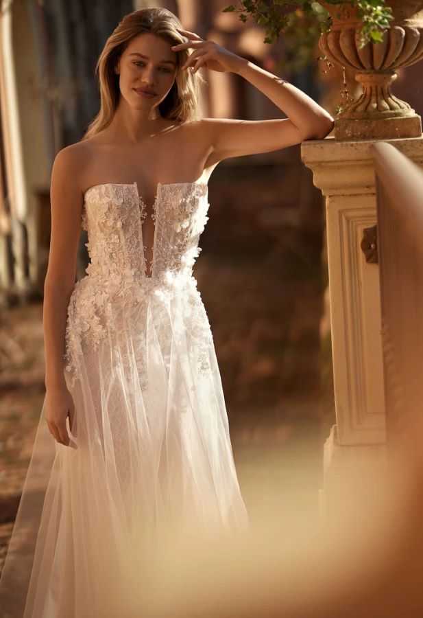Pollardi Fashion Group - Whimsy Strapless lace and tulle wedding dress with fitted skirt underlay and tulle overlay . Strapless wedding dress, flat body lace on bodice with 3D flower and beaded lace . I changed my sample order of the bodice my sample front plunge finishes 4cm above waistline and the width of the center plunge is narrower . The underskirt skirt is in body lace with split . The overskirt in tulle is soft with 3D flowers and beaded lace cascading to the side of skirt .