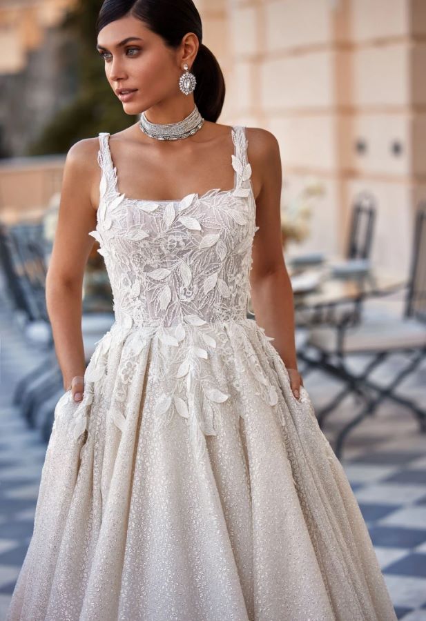 Pollardi Group -Wissa is a ball gown style wedding dress .The neckline is a square neckline , the is a lower square cut neckline . The bodice has structure which is great for bust support. The bodice is appliqued with 3D leaf in matte satin with fine beaded floral design , the applique cascades to the full volume skirt . The skirt has knife and box pleats made in a shimmer fabric , .