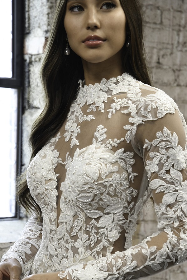 Featuring a high illusion neckline in sheer tulle, this gown is beautifully detailed with thoughtfully placed lace appliqués across the bust, shoulders, and down the fitted sleeves. Unbeaded and effortlessly elegant, the lace detailing highlights the figure, creating a sleek and sexy fit. The striking open keyhole back adds a modern, daring touch, while the flattering cut of the gown hugs the body in all the right places.
