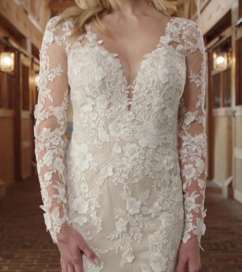 ✨ Essense of Australia D3673 is on SALE! ✨ Modern style with a vintage twist—this long sleeve sheath wedding dress is perfect for the bride who loves timeless elegance without beading. The lace features a delicate floral and leaf design with stunning 3D pop-up flowers for that romantic, textured look.