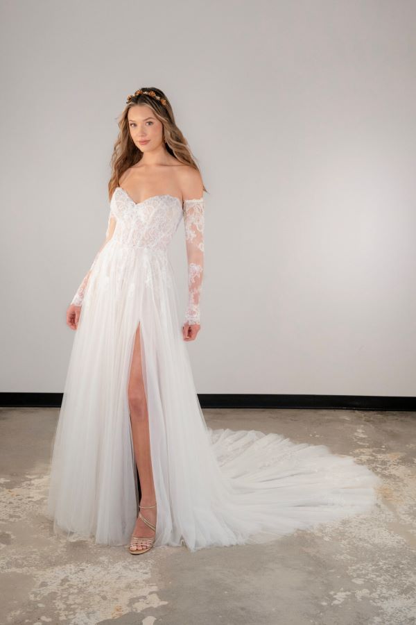 A soft, romantic A-line wedding dress with delicate detachable lace sleeves. The sheer lace bodice is lightly corseted for shape, featuring a flattering sweetheart neckline that softly defines the décolletage.