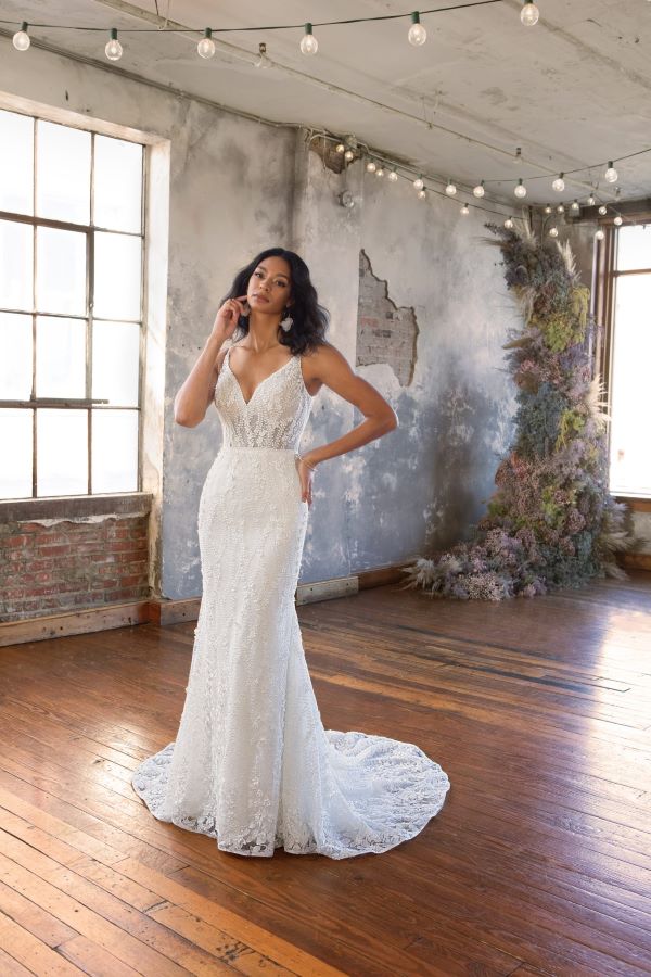 Modern boho meets timeless elegance in the Monro gown — now at an incredible 50% off! This sheath-style wedding dress features a modest V-neckline in the front and a deeper V back that dips just below the waistline for a subtly sultry finish. The opaque-lined bodice offers both comfort and structure, while the exquisite detailing steals the show. Tastefully embellished with 3D floral appliqués and delicate linear beading, Monro strikes the perfect balance between intricate and effortless. The lace detail is thoughtfully heavier along the hem, gradually fading upward to elongate the silhouette. Flattering and refined, this gown is a dream for the modern romantic.