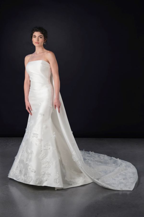 For the minimalist bride, this gown also comes in rich silk zibeline, offering a sleek, sculptural look without the floral embellishments. The matching cape, sold separately, completes the look with a dramatic flair—perfect for a grand entrance.
