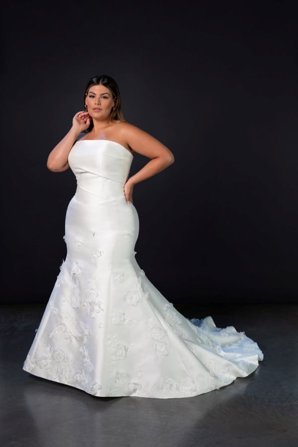 Martina Liana Style 1868 is the definition of modern couture bridal. A luxe fit-and-flare silhouette makes a bold yet timeless statement. The strapless neckline is cut clean and straight across, softened by diagonal pleated ruching that wraps the bodice in a flattering, architectural way. A subtle V-shaped waistline elongates the figure, leading into a two-panel skirt that hugs the body before flaring out gracefully. Delicate embroidered flowers are scattered from the skirt down to the hem, adding a soft, romantic touch.