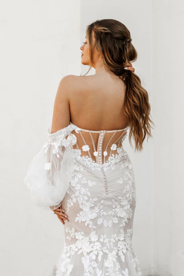 From minimalist crepe dresses to dramatic ballgowns and detachable overskirts, Essense of Australia offers versatility for every bridal vision. Brides can expect thoughtful features like corsetry support, customizable options, and inclusive sizing to ensure a flawless fit and feel.