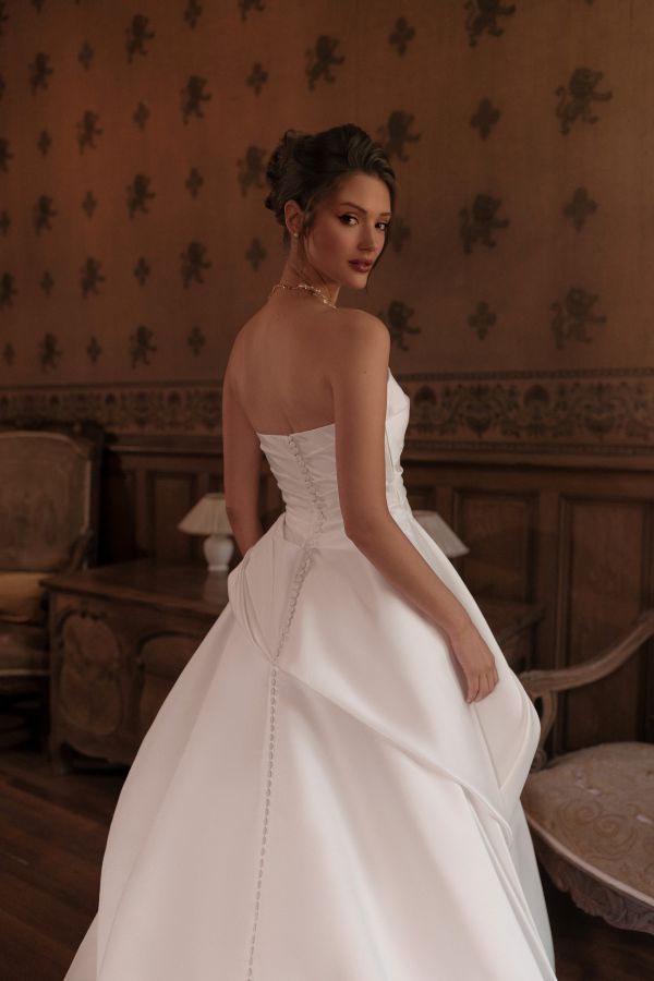 Katy Corso – Alaia Alaia is the embodiment of classic romance — like walking on a cloud. This dreamy gown features a strapless bodice with a subtle dip, creating a soft, flattering neckline. Elegant pleating flows gracefully across the bodice and continues into the A-line skirt, creating a gentle peplum effect that adds dimension and movement. A structured inner corset offers support and shape, secured with delicate loops and buttons at the back. Understated yet distinctive, Alaia is the perfect blend of timeless design and modern detail.