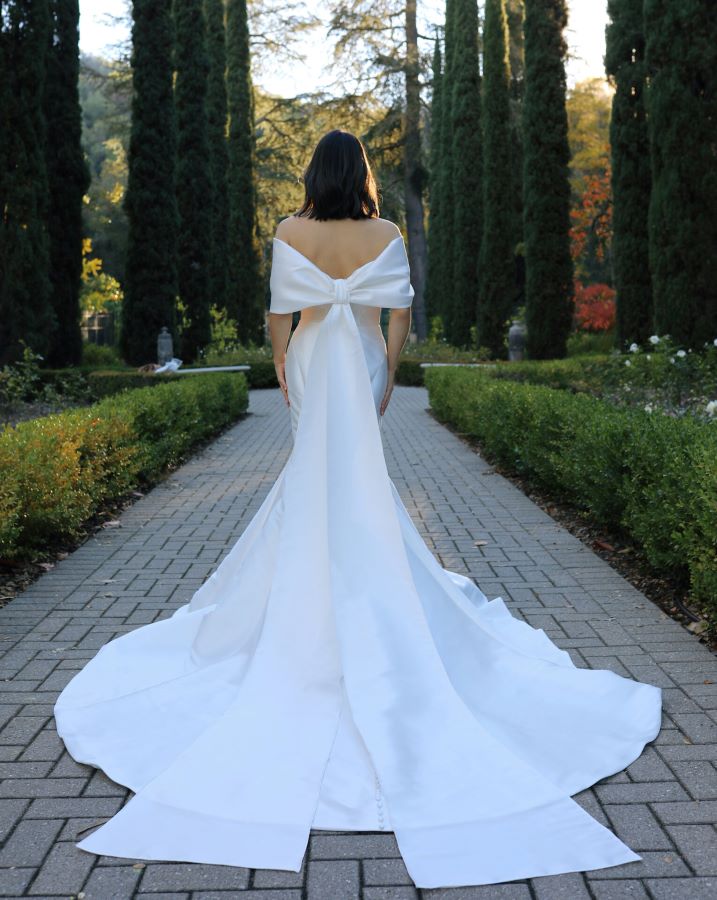 At the back, the band continues into a stunning couture-inspired bow, finished with two elegant tails that cascade down the back of the gown, adding a bold yet refined statement. Simple in its design, but with dramatic, high-fashion details, this dress is made for the bride who wants classic luxury with a modern twist.