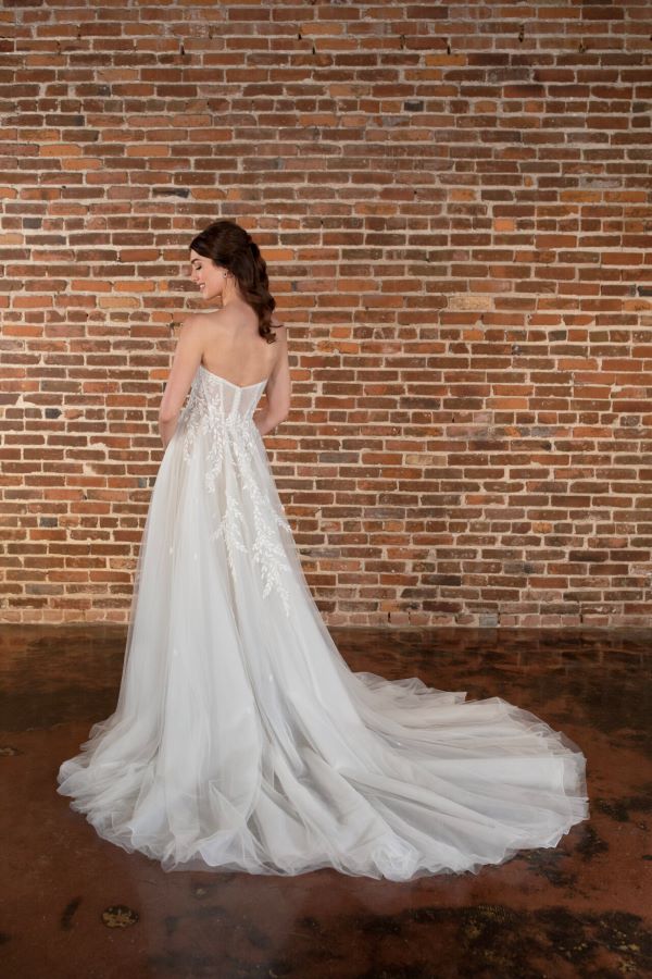 Essense of Australia - D3787 For the free-spirited bride, this BOHO-inspired wedding dress blends romantic details with effortless style. The strapless, sheer corset bodice features visible boning and delicate leaf lace appliqué, offering structure while keeping things light and airy. The soft tulle skirt flows beautifully with cascading leaf lace details and a modern side split that adds just the right touch of drama.