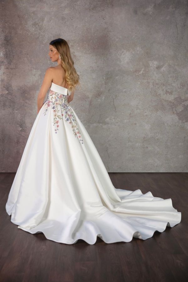For the bride who wants to make a statement, this breathtaking ball gown comes in classic Ivory embroidery or a unique colored embroidery option—perfect for those looking to stand out on their special day. The strapless bodice features a clean, straight-across neckline with a chic banded finish. Delicate embroidery starts at the bodice and softly scatters down into the full skirt, adding a touch of romance and whimsy. The skirt itself is beautifully structured with knife pleats, giving it that timeless ball gown volume. Our sample is in a plus size to showcase the incredible structure and support in the bodice—it’s designed to flatter and hold you in all the right places.