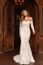 Matching lace sleeves add a touch of vintage charm and versatility. The lined lace skirt flares subtly below the hips, finishing with a scalloped lace hem that trails into a graceful train.