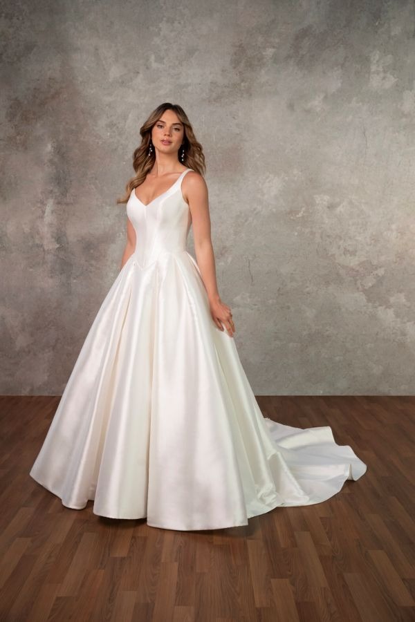 Perfect for the bride seeking structure, comfort, and a sophisticated modern take on a traditional ballgown.