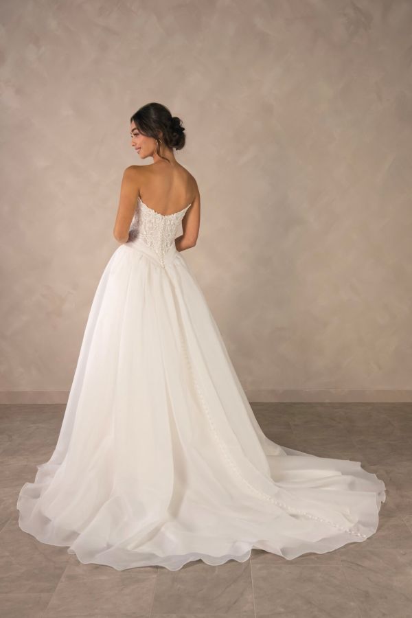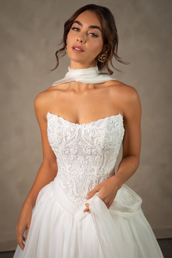 From minimalist crepe dresses to dramatic ballgowns and detachable overskirts, Essense of Australia offers versatility for every bridal vision. Brides can expect thoughtful features like corsetry support, customizable options, and inclusive sizing to ensure a flawless fit and feel.