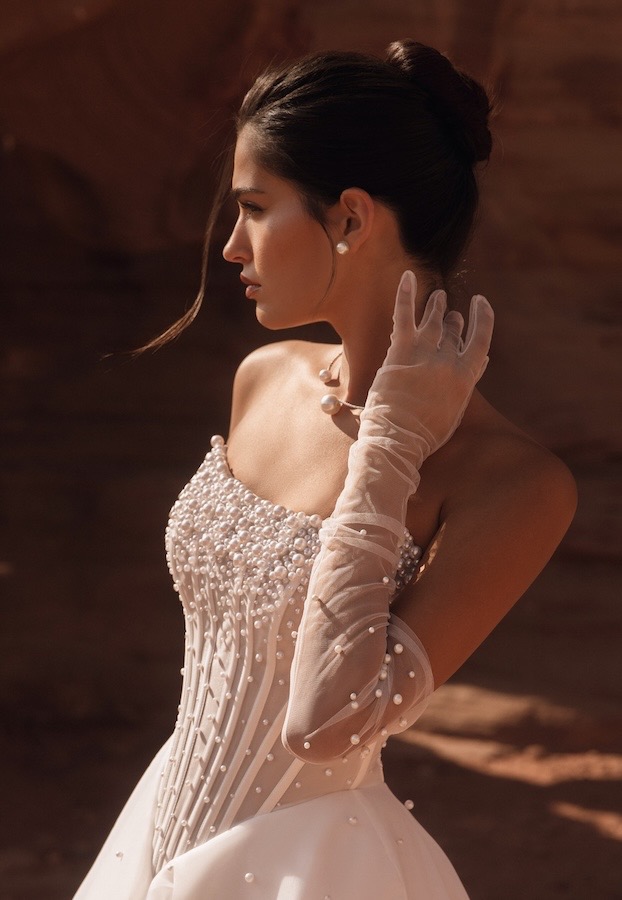 The look is completed with removable sheer mesh gloves adorned with scattered pearls — a poetic detail that makes Elody even more refined, feminine, and romantic. (available to purchase together or separately)