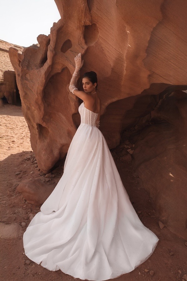 Elody — a gown of refined luminosity and modern fairy-tale romance. Its voluminous A-line skirt is crafted for brides who seek soft radiance and contemporary enchantment. The strapless corset, made from semi-sheer mesh and richly embellished with pearls that gradually disperse toward the waist, lends the look a delicate glow. The clean straight neckline beautifully accentuates the neck and collarbones, while the vertical boning visually elongates and narrows the basque waist. At the back, an internal lace-up construction and hidden zipper ensure a flawless fit. The multilayered skirt — created from airy organza, layers of tulle, and satin-lined atlas — cascades softly, forming an ethereal volume and cloud-like lightness of silhouette. The tactile delicacy of the fabrics enhances the impression of weightlessness and grace.