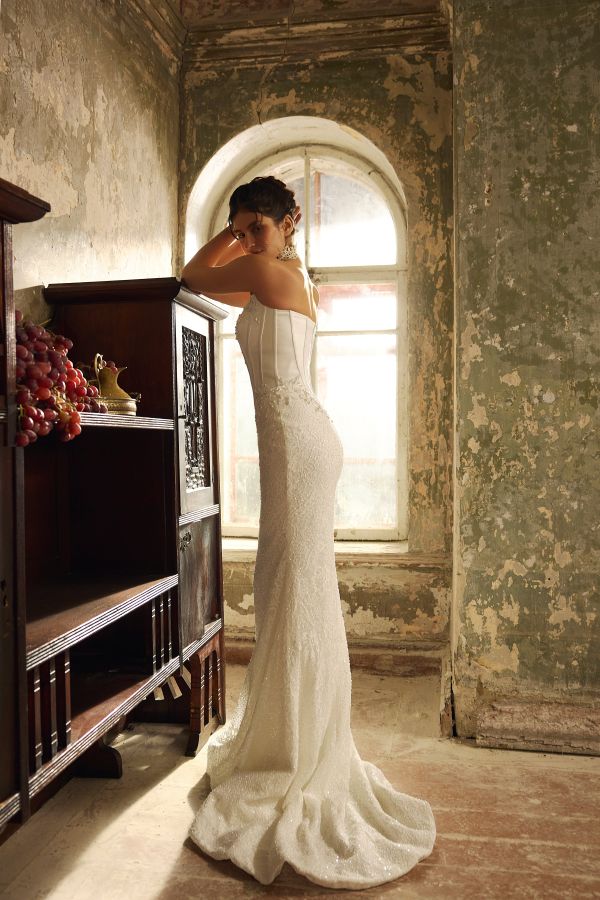 Lunia by Nomes is a structured sheath-cut wedding dress that blends modern elegance with striking detail. Crafted with a smooth satin bodice, it features visible boning for a sculpted finish and a pearl-detailed cat-eye strapless neckline for a refined, romantic touch. The basque waistline flows into a flattering V-shaped waist, highlighted with delicate pearl accents.